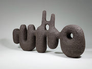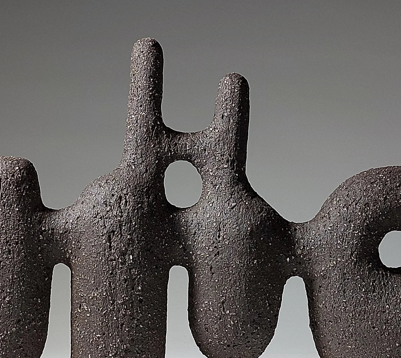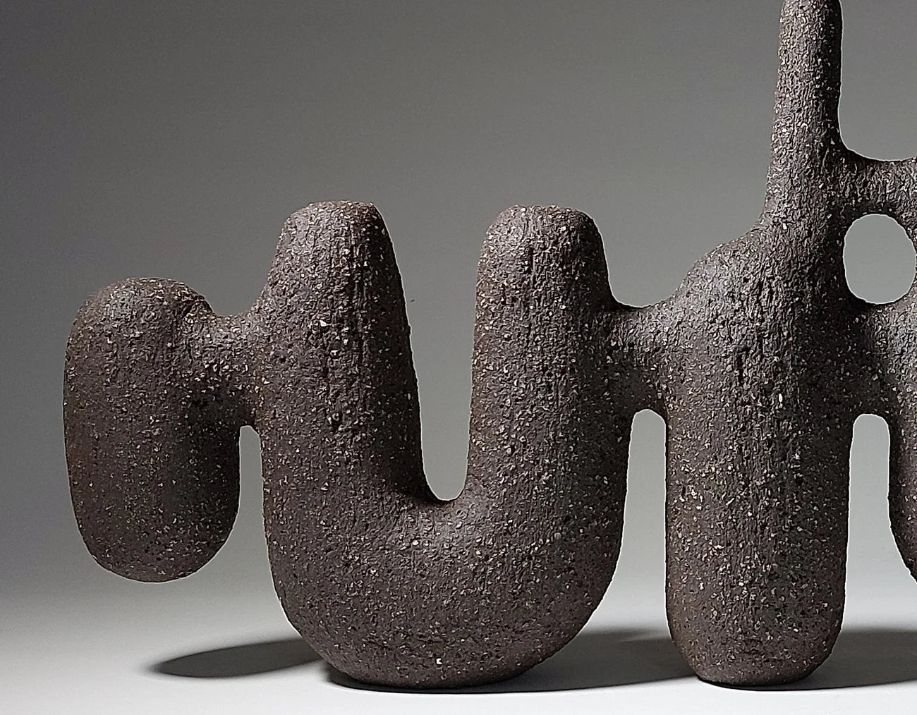 Echo Form is a hand-coiled ceramic sculpture made from coarse black stoneware clay. Its bold, looping shape curves in and around itself, creating a sense of movement, strength, and connection. With its open spaces and rising forms, it feels both grounded and energetic, an abstract gesture that invites curiosity.