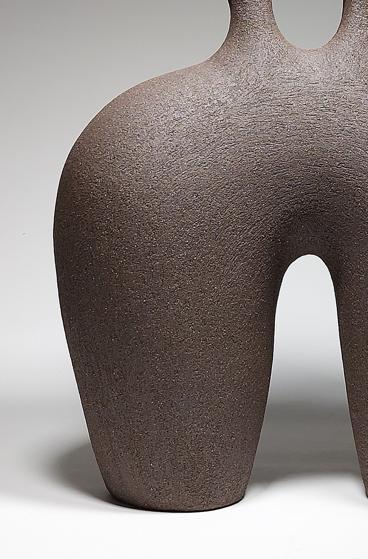 Hand-built in black stoneware, The Kiss explores the tension between strength and tenderness. The form rises from two grounded legs into a single, curving body that opens again at the top, suggesting either an intimate embrace or the poised arc of a female figure.